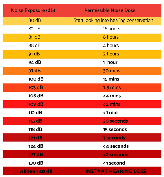 Exposure of even a few seconds to noise levels between 106 and 120 dB without hearing protection can instantly damage your hearing or even cause hearing loss.