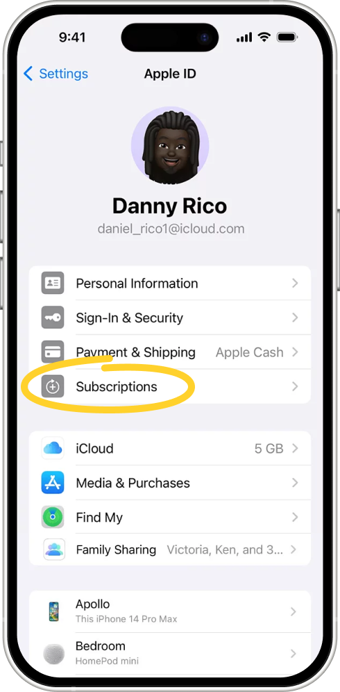 Go to your device’s Settings, click on your Name, and then click on Subscriptions