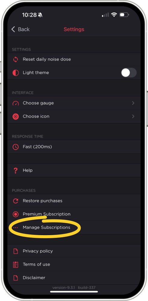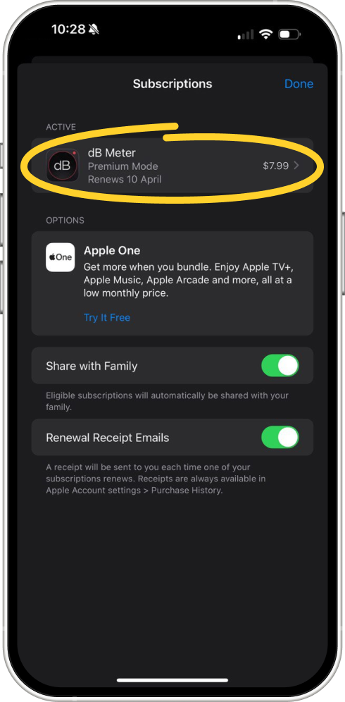 Open the dB Meter app and go to Settings. Under Settings, click Manage Subscriptions. This will open all the active and inactive subscriptions you have associated with your account. Find and click on dB Meter under the ACTIVE section. If you do not see dB Meter under ACTIVE subscriptions, this means that you do not have an active subscription to dB Meter.