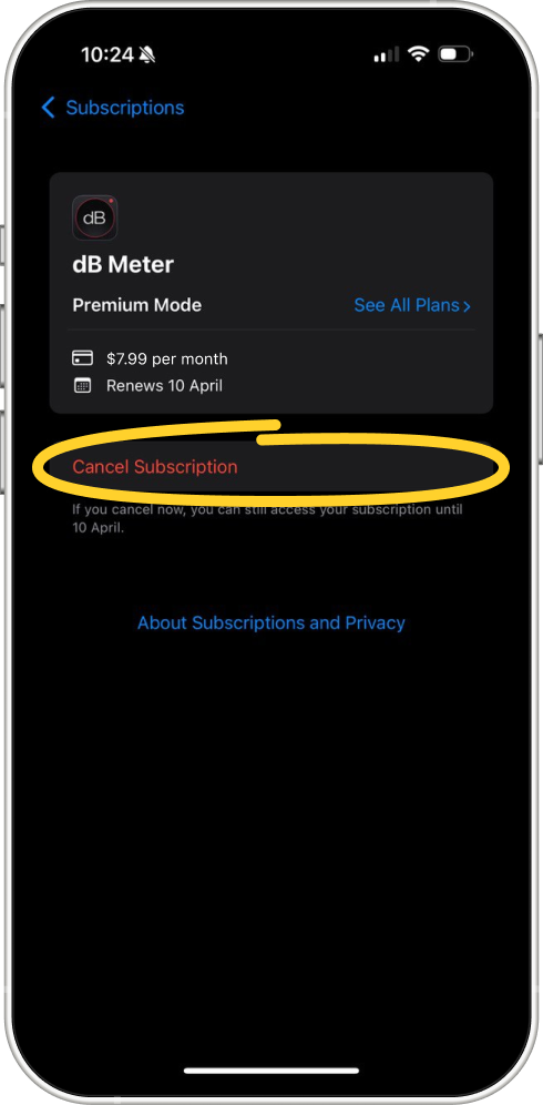 Find and click on dB Meter in the ACTIVE subscriptions section. If you do not see dB Meter in your ACTIVE subscriptions list, then you do not have an active subscription to dB Meter. If you see the app in your ACTIVE subscriptions list, click on it, click on Cancel Subscription, and then on Confirm Cancellation.
