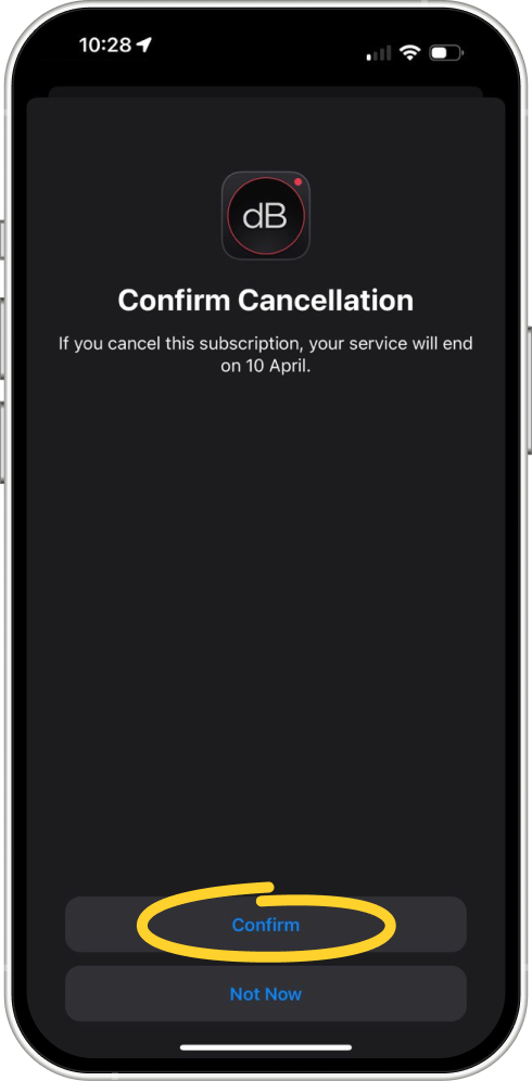 If you see dB Meter under ACTIVE subscriptions, click on Cancel Subscription and then on Confirm Cancellation.