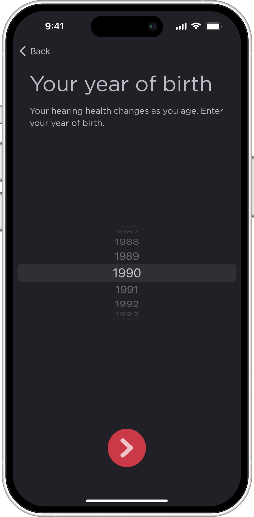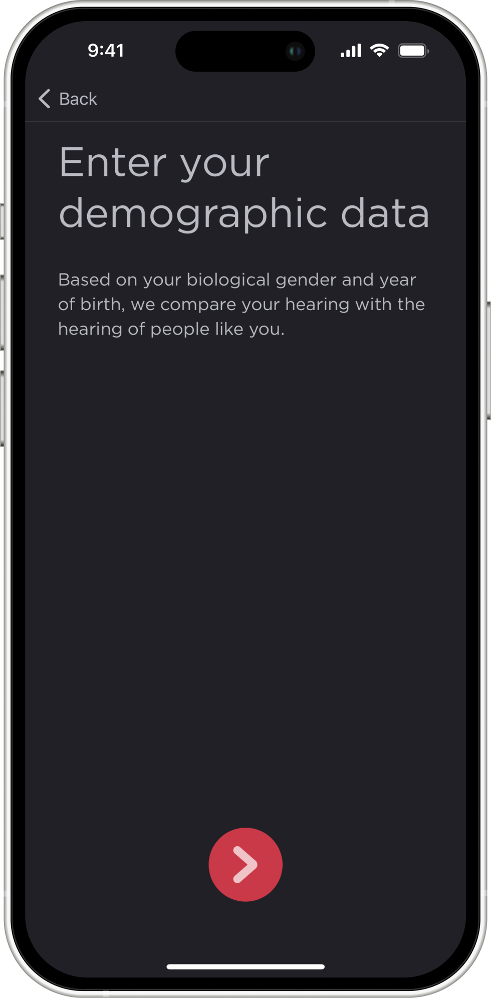 - At the end of the hearing test, the app will ask for your age (only the year of birth) and your gender. This is necessary for a more accurate analysis of your hearing, since hearing depends on gender and age, and in order to correctly calculate the audiogram, the program takes these aspects into account.