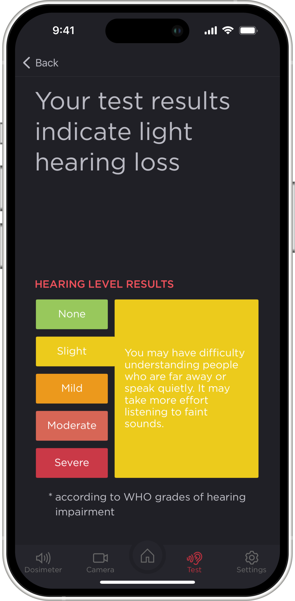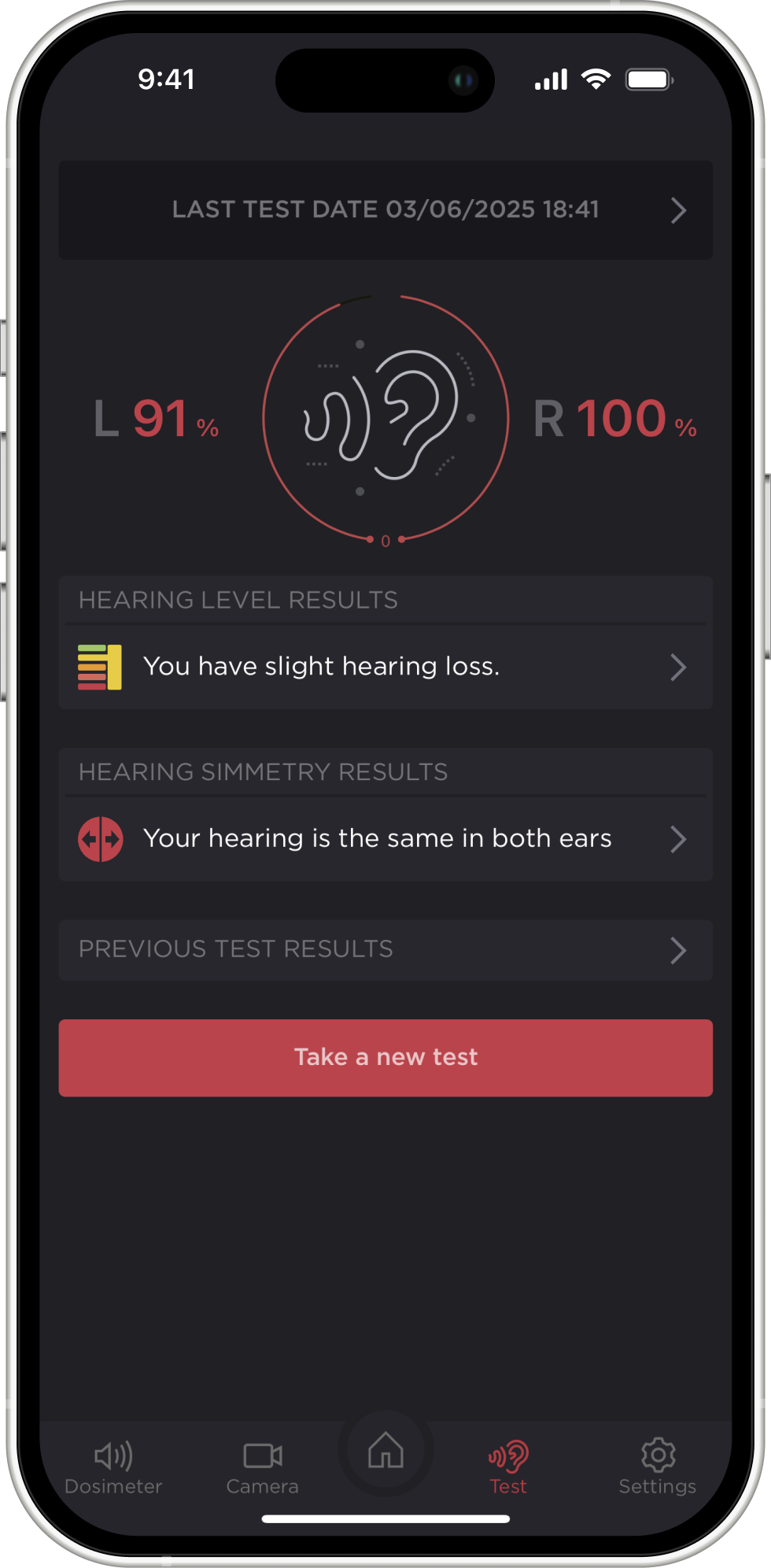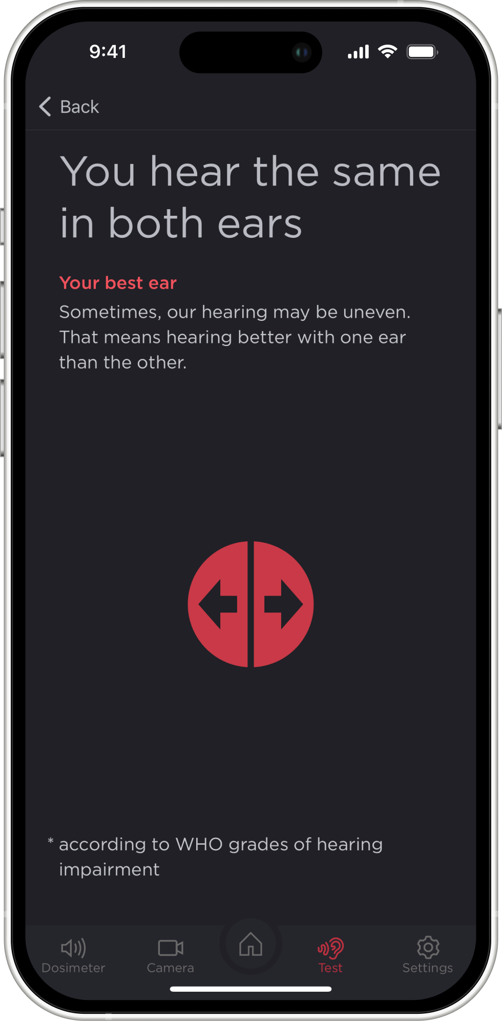 Once you reach the screen with the results of your hearing test, you will be able to clearly understand how good your hearing is, according to the most recent hearing test. You will also see some brief conclusions, such as whether there is any hearing loss and which ear hears better. By clicking on any element, you can get a more detailed description.