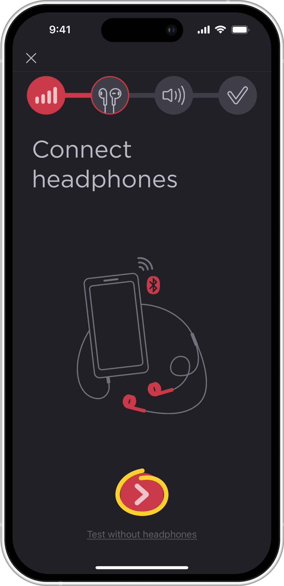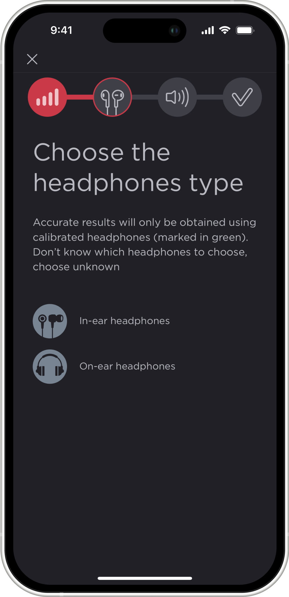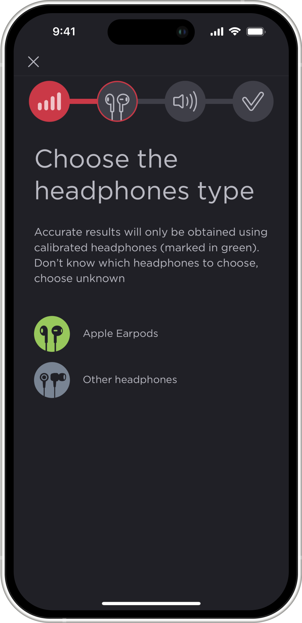 - Connect your headphones. Different headphones reproduce sound differently due to their specific design. The app is calibrated for use with AirPods (see the list of supported headphones below), so when using AirPods, the results you will get will be as close as possible to those you could get from an audiologist. However, you can take the hearing test with any other headphones or even without any headphones at all. The accuracy of the results will be lower, but you will still be able to get information about the state of your hearing.