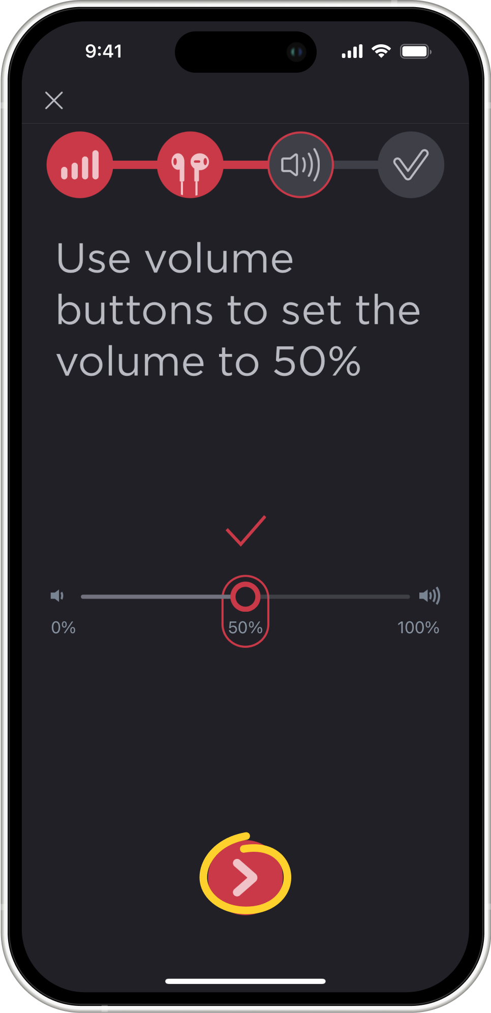 - Set the volume to 50%. This can be done using the volume buttons or the slider on the screen.