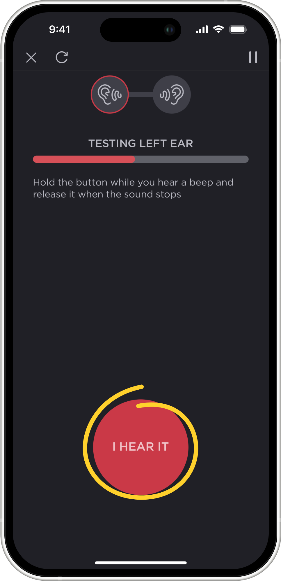 - When the test starts, the left ear is tested first. The program plays pulsating sounds of different frequencies and volumes. At the bottom of the screen, you will see a button labelled “I HEAR IT”. If you hear a sound, press the button and hold it. While you hold the button down, the program will make the sound quieter, quieter, and quieter. As soon as you stop hearing the sound, release the button. The volume will then increase. As soon as you start hearing the sound again, press and hold the button again. This way, the program understands the frequencies and volume levels you can hear and the ones you cannot. When the left ear test process is complete, the same is repeated for the right ear.