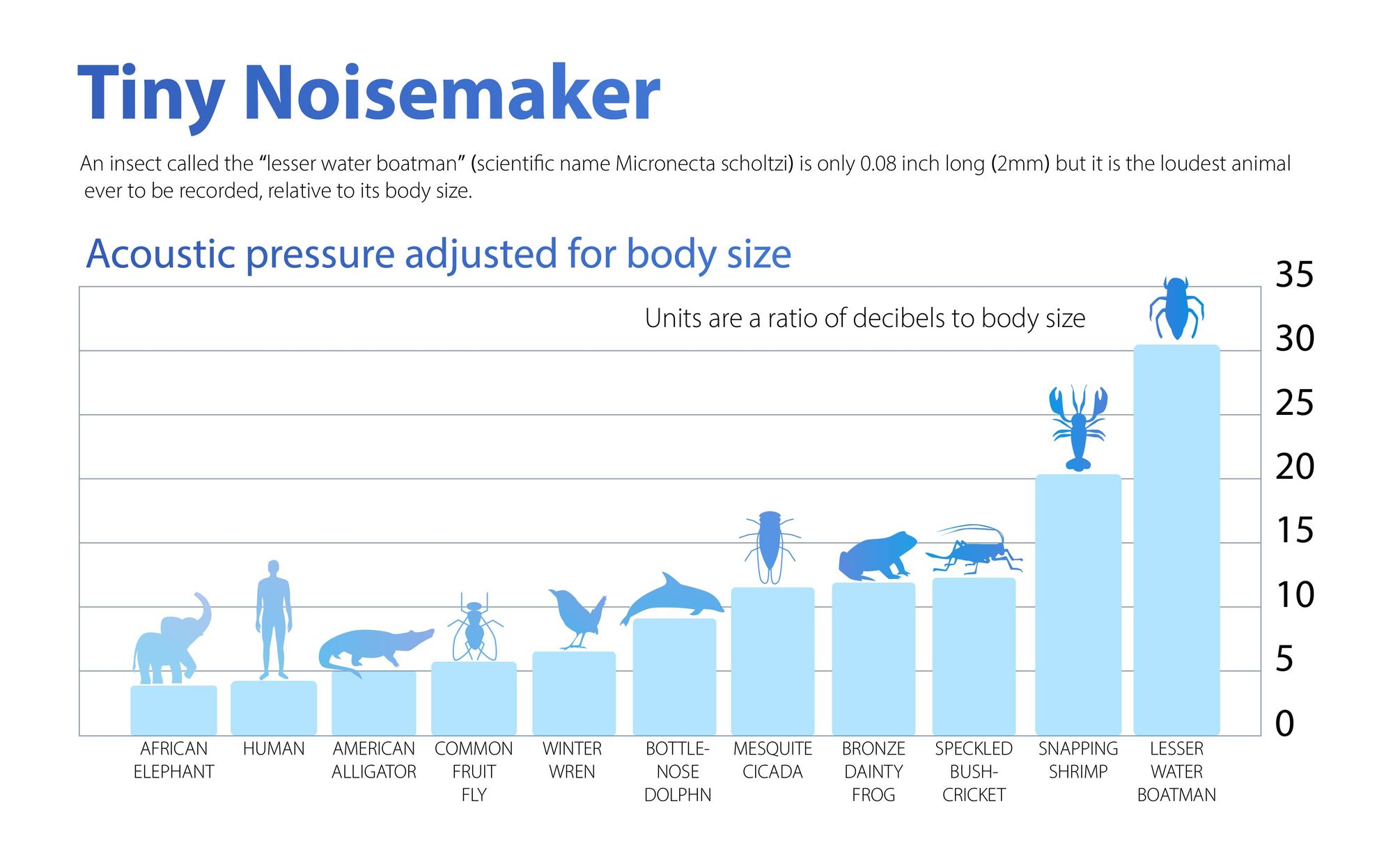 When you put things in perspective, you’d expect one of the largest animals on Earth - the sperm whale to be capable of producing sounds as loud as 230 dB. But when you consider that the tiny water boatman is just a little insect, it becomes remarkable that it is capable of producing sounds as loud as 99.2 dB.
